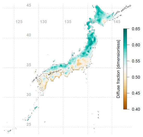 Annual diffuse fraction map of Japan (interpolated using 837 data points). The diffuse fraction is the ratio of diffuse horizontal irradiance (DHI) and global horizontal irradiance (GHI).