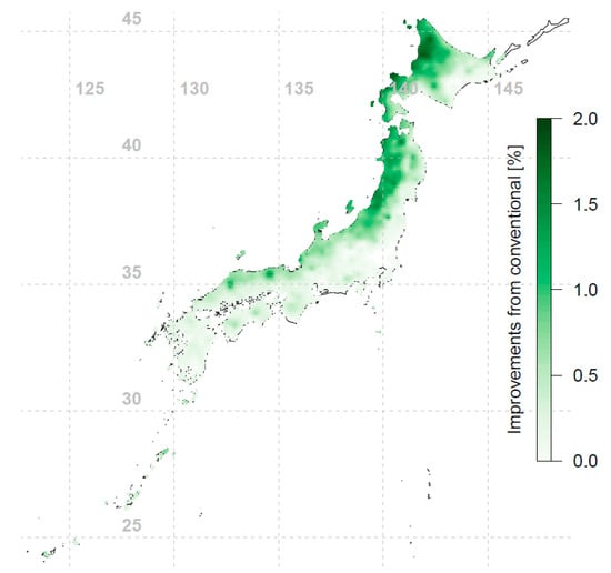 Next, the percentage increase in annual irradiation on a fixed-tilt PV module surface mounted at the optimal orientation and tilt angle compared to a south-facing latitude-tilted PV module was determined (see Figure 7). As can be seen, the increase in annual tilted irradiation for an optimally oriented and tilted PV module is up to 2%. The gain is highest in the northwestern region of Japan. This is because the optimal tilt angles in this region deviate more from latitude, due to the high annual diffuse content.