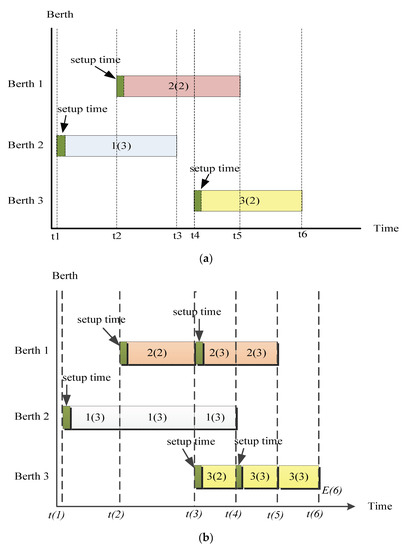 A berth plan has been usually used to represent a solution to the simultaneous DDBAP and DQCAP. Figure 1a illustrates a berth plan with time-invariant QC assignment in which each rectangle represents a ship. For example, the rectangle with the denotation “1(3)” indicates that ship 1 is assigned with 3 QCs. With the time-invariant QC assignment, each ship has one time of QC setups and movements for assigned QCs with these QCs not to be further changed during the whole service.