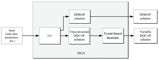 To solve the simultaneous DDBAP and DQCAP, three HGAs are developed in this section. Figure 2 illustrates the solution process of a HGA that hybridizes a GA with an event-based heuristic. First, a HGA employs a GA used to generate a BAP solution and a time-invariant QCAP solution. Secondly, it transforms the time-invariant QCAP solution into a variable one using the event-based heuristic. The GA model and the event-based heuristic are detailed in Section 4.1 and Section 4.2, respectively.