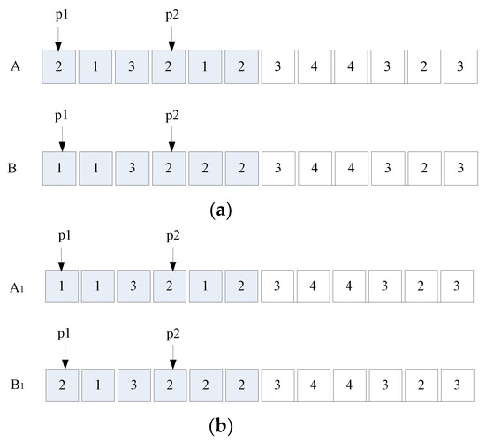 The crossover operator is used to generate offspring chromosomes. It works as follows. As shown in Figure 4a, it selects two points (p1 and p2) as a matching section from two parent chromosomes (A and B). Then, it switches all the elements in the matching section between the two parent chromosomes. After crossover operation, it results in two offspring chromosomes (A1 and B1) as shown in Figure 4b.