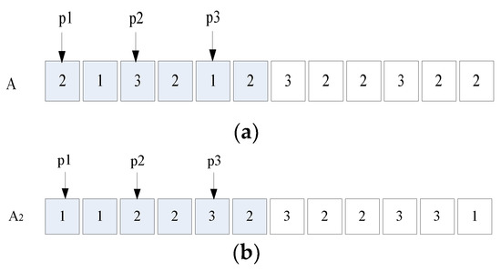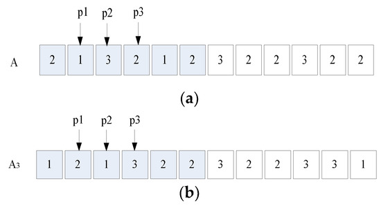 - Thoros mutation: as shown in Figure 6a, three gene positions p1 < p2 < p3 are chosen randomly, which shall take the different positions not necessarily successively. Then, the gene value of position p1 becomes the gene value of position p2, the original gene value of p2 becomes the gene value of p3, and finally the original gene value of p3 becomes the gene value of p1. After mutation, Figure 6a becomes Figure 6b.