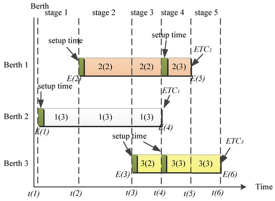 This equation, however, does not take the times of QC setups and movements into account, thus we expand that equation as Equation (2) to estimate the actual operational time for a ship j at a time period t (denoted as ). In addition, it is assumed that QCs can be sequentially repositioned by a pushing-in and pulling-out procedure to another berth, but cannot cross over each other.