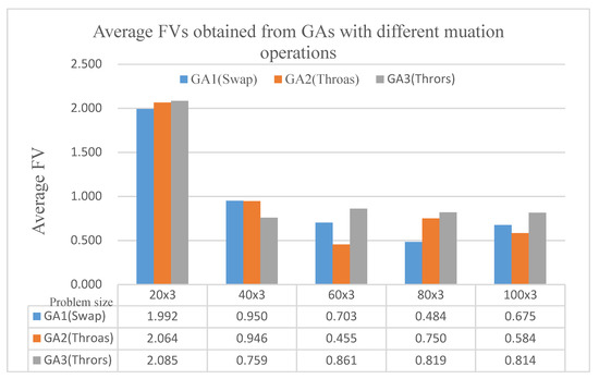 Figure 10 depicts average FVs obtained from the three GAs with time-invariant QC assignment at differ problem sizes of n × 3 (with n = 20, 40, 60, 80 and 100). The average FV shows a downward trend when more ships are calling at the port. It is found that GA1 has the worst average FV; GA2 has the second best average FV; the GA3 has the best average FV.