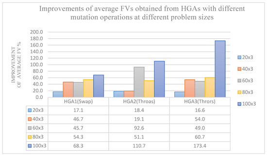 The improvements of average FVs obtained from different HGAs at different problem size n × 3 (with n = 20, 40 to 100).
