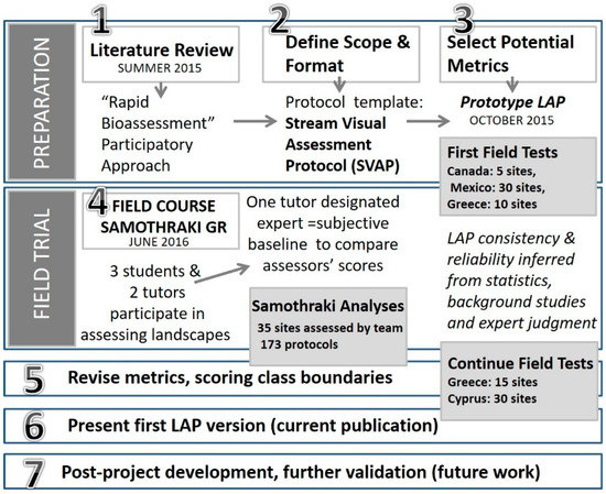 The workflow for the protocol development has evolved through the following stages (Figure 1). Step 1: Review of assessment methods, Step 2: Format and protocol framework and template selected, Step 3: Potential metrics selected, first prototype LAP constructed, Step 4: Field trial; Step 5: Revision process, Step 6: Current publication, Step 7: Future work.