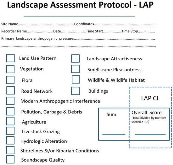 We introduce the landscape assessment protocol (hereafter LAP). The key objective was to produce a simple field method for assessing the conservation condition or state of landscapes to be used both by professionals and trained citizen scientists. This is a landscape quality index that broadly follows tenets of landscape ecology [3], landscape history and natural history and site-based bioassessment surveys [43,44]. Accurately measuring the state of a system is a complex process that often resorts to the use of indicators in order to evaluate performance [45], or a “status” based on a pre-conceived reference condition. As expressed by Mazri and colleagues [46], indicators are “mental constructs aiming to capture one or several aspects of reality considered of importance when it comes to a specific subject”. The use of indicators is meant to provide synthetic and action-oriented knowledge; in our case, a rapid conservation assessment. Our index calculation follows the format and field form template of the stream visual assessment protocol (SVAP), a popular interdisciplinary field-based “bioassessment” approach to assess river and stream corridors [37], which has also been adapted for use in broader assessment procedures (e.g., [33]). LAP was developed using similar development steps as SVAP (see [39]) and contains 15 metrics (or indicator attributes); however, nearly all are very different from the original SVAP. Each metric is a quality or characteristic element of the landscape that is known to predictably alter when influenced by human-induced pressures or changes. Each metric reflects the quality of a different aspect of the ecosystem or in our case the "landscape system" that responds to different anthropogenic stressors [43,47]. This new assessment protocol is to our knowledge the first bridging of this type of field bioassessment-based protocol to landscape conservation assessment.