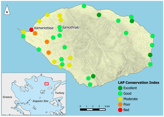 Figure 3 maps the LAP Conservation Index results from 35 assessed sites on Samothraki as assessed by the designated expert member of the team. Most of these sites offer panoramic views across the island’s high relief landscapes and there is very little overlap among them although some are quite close to each other. Thirteen sites fell below the good class boundary (i.e., unfavorable conservation condition), but only three and one of these were assessed in poor and bad condition, respectively. The degraded sites were situated in the western part of the island, especially near the port town of Kamariotissa and particularly the adjacent coastal and lowland areas. In this part of the island, there are signs of localized infrastructure construction, new buildings with associated modern anthropogenic changes and locally overgrazed conditions. Otherwise, much of the rest of the island is deemed to be in a favorable conservation condition, and this includes areas even within the urban center of the old town of Samothraki (also known as the Chora, a protected traditional settlement).