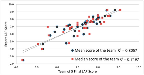 Overall, the correlation among the five-person team results (mean and median) and the single expert scores for each site was positive (Figure 4).