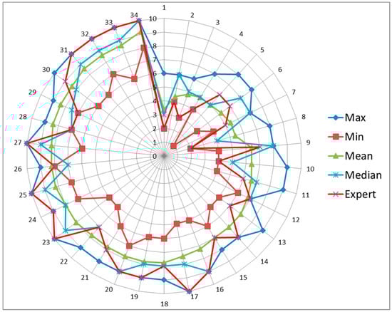Results of five-person team scores (max, min, mean. median) and the single expert for each site (N = 35) for the “land use pattern” metric.