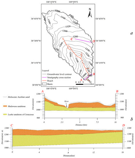 (a) The groundwater level contour map of the Hailiutu River basin and (b) Stratigraphy cross sections (A–B and C–D) of the Hailiutu River basin from Geological Cloud (http://geocloud.cgs.gov.cn/).