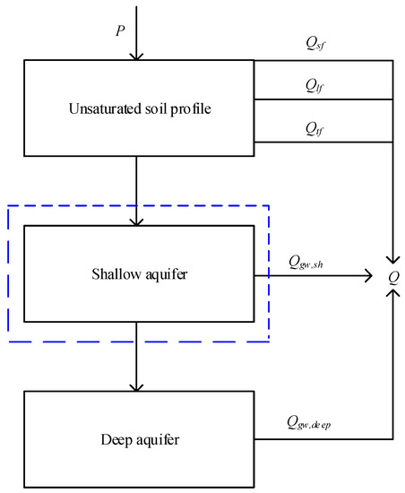In the SWAT model, the source of streamflow was mainly divided into four components, namely surface flow (Qsf), tile flow (), lateral flow () and groundwater flow (), as illustrated in Figure 3. The groundwater flow could be sub-divided into shallow groundwater flow and deep groundwater flow which come from shallow and deep aquifers, respectively.