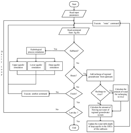 Despite its widespread application, the performance of the SWAT model varies significantly in different cases. Consequently, some researchers have modified the SWAT model to satisfy their specific requirements. Qi et al. [15] proposed an energy balance module for SWAT to improve the simulation accuracy for snowmelt. Chen et al. [16] modified the SWAT auto-irrigation functions to improve the simulation accuracy of agricultural irrigation management. Tsuchiya et al. [17] proposed an enhanced paddy simulation module to improve the simulation accuracy of paddy water balance. In the original SWAT, a hydrologic response unit (HRU) is a minimum calculation unit, and there is no exchange of water between different HRUs. In each HRU, two-layers aquifer model, shallow/unconfined aquifer and deep aquifer/confined aquifer, are used to represent the aquifer system, and a linear reservoir model to simulate groundwater flow. The water of a shallow aquifer could move to the deep aquifer, while the reverse process is not allowed. Using this computational method to simulate groundwater flow may lead to inaccurate results for the areas where a groundwater system is complicated, and the river is predominately recharged by groundwater. Shirmohammadi et al. [18] observed that the SWAT underestimates groundwater flow, especially during wet periods, in a piedmont physiographic region. Amatya et al. [19] found that the SWAT was unable to get accurate monthly outflows simulation results when it was applied to simulate streamflow in a karst watershed where runoff was dominated by groundwater. Cheng et al. [20] observed that the SWAT model was not effective in simulating the base flow in the Kuye River basin, a basin with coarse sand in the middle of the Yellow River watershed with a semi-arid climate. Similarly, Pfannerstill et al. [21] found out that the SWAT model performed poorly for low flow periods in North German lowlands. Wu et al. [22] also pointed out that the SWAT model underestimates groundwater flow in a dry year. Several studies have indicated that outflow from groundwater storage is not linearly proportional to storage [23,24]. Therefore, some researchers have modified the groundwater module of the SWAT model to improve the simulation accuracy. Wang et al. [25] modified the linear reservoir model, which is used to calculate groundwater flow, to a nonlinear reservoir model in a Karst area. Similarly, Gan and Luo [26] used a nonlinear reservoir model to calculate base flow in glacier and snowmelt-dominated basins. Some researchers used multi linear reservoirs to reflect the nonlinearity of outflow. Pfannerstill et al. [21] divided shallow groundwater storage into fast storage and slow storage in a lowland catchment.