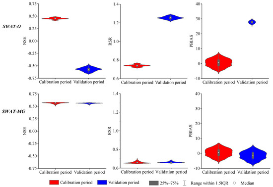 Based on the calibrated range of parameters of Table 2, 1000 group parameters were generated by the Latin hypercube sampling method for SWAT-O and SWAT-MG, respectively. These group parameters were applied to drive two SWAT versions to investigate the difference of performance in SWAT-O and SWAT-MG. Figure 5 illustrated the comparison of 1000 group evaluation criteria values between the SWAT-O and SWAT-MG during the calibration and validation period, respectively. As shown in the Figure 5, in both SWAT versions, the distribution of PBIAS is more even than the other two evaluation criteria. For the SWAT-O, the performance had a significant difference between the calibration and validation period. For instance, the median of NSE was about 0.47 in the calibration period while it decreased to about −0.62 in the validation period. Different from SWAT-O, SWAT-MG has a similar performance during calibration and validation period. For streamflow simulation, the model performance can be identified as satisfactory if NSE > 0.5, RSR < 0.7 and −25 < PBIAS < 25 [43]. That means the performance of SWAT-MG could be considered as satisfactory in both calibration and validation period. In general, SWAT-MG has a better performance than SWAT-O on all evaluation criteria.