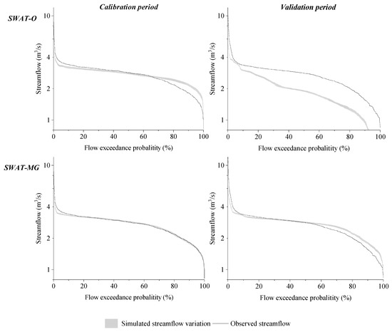 Combined with the performance of calibration and validation period, the best 40 simulated streamflow of SWAT-O and SWAT-MG were selected to calculate the variation range of flow duration curve (FDC). For comparison, the FDC of observed streamflow was also presented (Figure 6). In both calibration and validation period, SWAT-O and SWAT-MG have similar performance in the FDC segment from 0% to 10%, both SWAT versions tend to underestimate the peak flow. Compared with SWAT-O, SWAT-MG produces less underestimation. In the FDC segment from 10% to 60%, both SWAT versions have similar performance in the calibration period, however, the SWAT-MG performs better than SWAT-O in the validation period. In the FDC segment from 60% to 100%, SWAT-MG could better reproduce the variation of observed FDC while SWAT-O tended to overestimate the streamflow in the calibration period. In the validation period, SWAT-MG mainly overestimates the streamflow while SWAT-O significantly underestimates the streamflow. Studies shown that, in the 1980s, the agricultural land has increased and amount of irrigation water also increased [33,39]. These variations were difficult to exactly reflect in the SWAT model. Consequently, SWAT-MG tended to overestimate the observed streamflow in the validation period.
