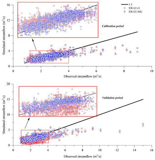 Based on the aforementioned analysis, a group of parameters that could obtain the best performance was selected as the optimal parameters for SWAT-O and SWAT-MG (Table 2). The best simulated streamflow of each SWAT version could be obtained by using optimal parameters to run the model. Figure 7 shows the scattered comparison of the simulated streamflow of two SWAT versions with observed streamflow. In the study period, the average annual streamflow was about 2.73 m3/s. The daily streamflow, which was more than 4 m3/s generally occurred in the rainy season and this value located at about 5% of FDC (Figure 6). Therefore, the daily streamflow could be considered as peak flow if it is more than 4 m3/s in the study area. It is indicated from Figure 7, although two SWAT versions underestimated streamflow during peak flow, simulation results show that SWAT-MG produced less underestimation, which means SWAT-MG is better than SWAT-O. For the non-peak flow, the simulated points of two SWAT versions were distributed relatively uniform on the 1:1 line while the simulated points of SWAT-MG were closer to 1:1 line than SWAT-O.