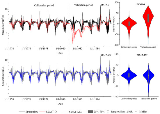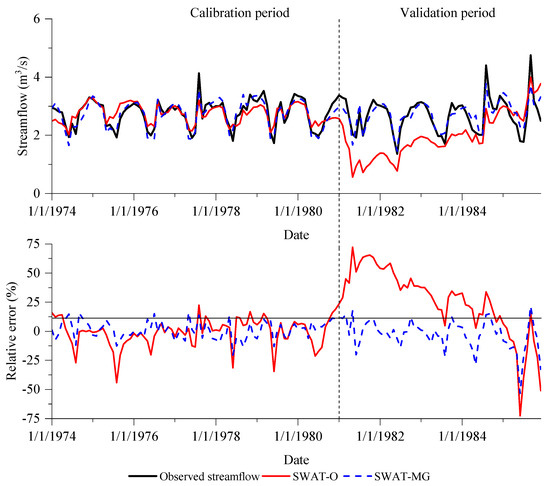 Figure 8 illustrated the comparison between the daily observed and simulated streamflow. As shown in Figure 8, in the calibration period, SWAT-O and SWAT-MG could simulate the variation tendency of streamflow, nonetheless, the real flow fluctuation is larger than the simulated ones. At the beginning of validation period, the simulated streamflow of SWAT-O presented a steeply decreased trend and obviously underestimated the streamflow, while SWAT-MG could better reproduce the variation of streamflow. Figure 9 illustrated the comparison between the monthly observed and simulated streamflow. Similar to the results of daily scale, SWAT-MG outperformed SWAT-O in both the calibration and validation period. The values of NSE, RSR, PBIAS of SWAT-O and SWAT-MG are listed in Table 3 for both the calibration and validation periods at daily and monthly scales. As shown in Table 3, all criteria values of SWAT-MG were higher than SWAT-O, which indicated that SWAT-MG performed better than SWAT-O. The variation of NSE, which emphasizes high flow errors [45], was more apparent than the others. This suggested that the modified groundwater module contribute to improve performance of peak flows simulation, which is in accordance with Figure 7.