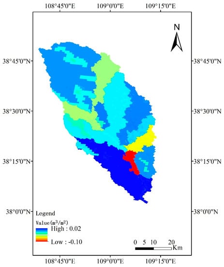 The modified SWAT model adopted water depth difference of shallow aquifer and deep aquifer to calculate the amount of water interaction between these two aquifers. Similar to the surface flow, the groundwater from regional aquifer was allowed from upstream flow to downstream of study area. Figure 10 presents the spatial distribution of annual seep water from shallow aquifer simulated by SWAT-MG. The positive value of Figure 10 means the shallow aquifer recharges to deep aquifer while the negative value means the deep aquifer recharges to shallow aquifer. As shown in the Figure 10, the deep aquifer will receive recharge from shallow aquifer in the upstream of study area and recharge to shallow aquifer at the sub-basin which belong to intersection of stream. At the downstream of Hailiutu River basin, the groundwater of regional aquifer was allowed to drain to stream. Therefore, the water depth of deep aquifer of this sub-basin was smaller than the shallow aquifer, and the deep aquifer will receive recharge from shallow aquifer.