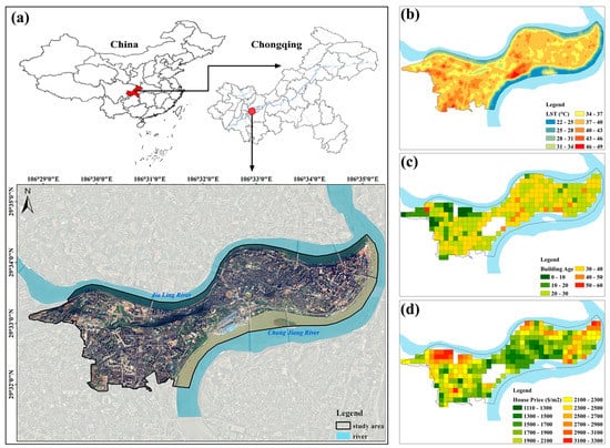 (a) Location and study area; (b) distribution of land surface temperature; (c) distribution of building age at a 250 m grid scale; (d) distribution of housing price ($/m2) at a 250 m grid scale.