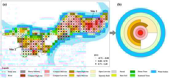 Distribution of Local Climate Zone (LCZ) classes (a) and a typical circle-layer distribution pattern of the study area (b).