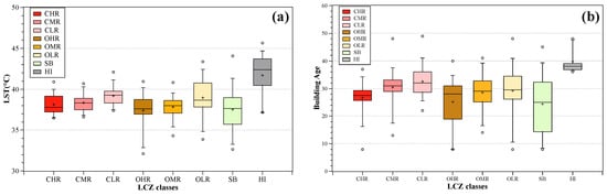 The mean LST among different LCZ classes are as follows (in descending order): heavy industry (HI) (41.96 °C), CLR (39.20 °C), OLR (38.94 °C), CMR (38.36 °C), CHR (38.11 °C), OMR (37.83 °C), SB (37.52°C) and OHR (37.38 °C) (Figure 4a). The HI class in this study area is a railway station, featuring a large amount of metal materials and high SVF, combined with a massive energy consumption and high population density of commuters, making its LST higher than that of the others. The compact classes (CLR, CMR and CLR) have a higher LST than the open classes (OLR, OMR and OHR). Typically, the compact spatial forms have a higher building density, population density and impervious surface fraction, as well as a lower fraction of open space (e.g., green space and blue space) than open spatial forms, which is also presented in Table A1. Thus, the compact areas feature a higher anthropogenic heat release and solar radiation absorption than the open areas, causing heat accumulation in the compact areas and a higher LST.