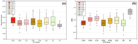 Boxplots of housing price (HP) (a) and heat vulnerability index (HVI) (b) in different LCZ classes.