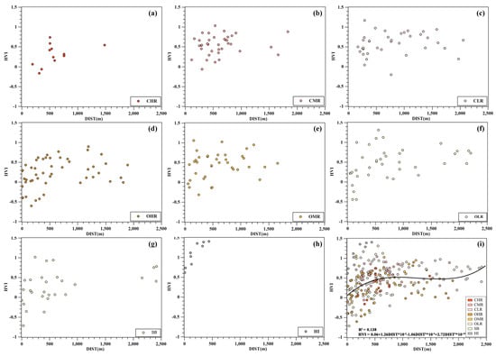 Scatter plot of HVI and LCZ classes ((a) CHR classes; (b) CMR classes; (c) CLR classes; (d) OHR classes; (e) OMR classes; (f) OLR classes; (g) SB classes; (h) HI classes; (i) all LCZ sample classes) in terms of the distance from water bodies (DIST).