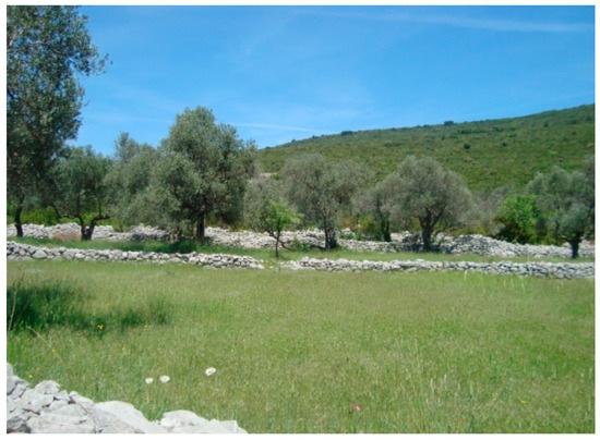 27]. Olive groves are bounded by drystone walls. Drystone walls are also dominant as supports to terraced terrains in which olives trees were planted, as olive growing used to be very extensive (