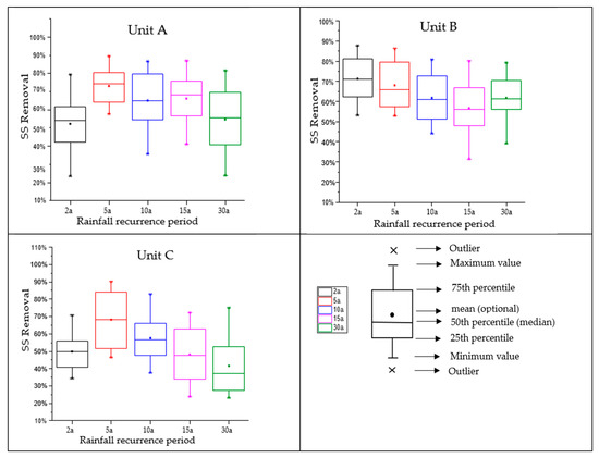 Earlier studies revealed that bioretention has the ability to capture SS and other solids due to its capacity for sedimentation and filtration [28]. Figure 4 reveals that the removal rate of SS in all 3 units reached the highest level at the 5-year return period, and decreased slightly afterwards. The removal efficiency of SS fluctuated greatly in the single inlet process, but the average removal efficiency varied slightly in different structures of the bioretention units and in different recurrence intervals. However, the impact of climate-change-induced precipitation increase on SS retention has not been clearly assessed [29]. The concentration of SS in effluent was generally stable at 30 mg/L, and some effluent SS could even be optimized below 20 mg/L. In the current study, under the five rainfall scenarios, the average removal efficiency in unit A and B was around 64%, comparatively lower than other studies. Brown and Hunt demonstrated that removal performance for the SS was less variable than other nutrient parameters, the value of which was between 70 to 80% [28], whereas the SS removal rate was consistently over 95% in the work of Bratieres et al. [30]. Hatt et al. presented that loads of SS were effectively reduced by all filter types, despite variability in inflow pollutant concentrations [31]. Only the initial runoff SS concentration reached 150 mg/L, and then the influent SS concentration was maintained at 60 mg/L in the current experiment. When compared to the removal rate of unit A and unit B, it indicated that a higher filter layer would bring better results, which is consistent with the conclusion obtained by Brown and Hunt [28].