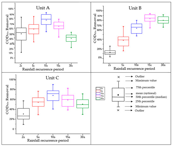 Figure 5 presents the mean concentration removal efficiency for CODMn. It revealed that in the early stage of the systems, due to the decay of the wood chips added by the artificial filler, the number of microbes in the system was too small to decompose large quantities of pollutants, resulting in the lower removal efficiency (≥12.7% in unit B). After the systems were stabilized, the degradation of organic matter was promoted with the increase of oxygen content and the microbial population of the systems, leading to the rapid increase of the CODMn removal in the three bioretention units (the highest removal rate of unit B in the 15 year recurrence interval reached up to 94.2%). Li et al. found that the CODMn removal efficiency with different thicknesses of filter varied between 65%~75% [32]. However, as the experiment continued, with the further increase of the rainfall recurrence interval, the CODMn adsorption capacity of the filler was gradually saturated. Under scouring action of the runoff, the CODMn leaching from the filler led to a gradual decline of the removal effect. The same phenomenon appeared in the experiment of Jiang et al. and Shrestha et al. [19,33]. Among the three bioretention units, unit A showed the best performance on CODMn removal. It could be deduced that CODMn removal was least affected by the rainfall intensity in the case of the higher filler layer, which was similar to the findings of Liu [34]. Unit B showed better performance than unit C, indicating that setting a submerged zone could improve CODMn removal efficiency in some extent.