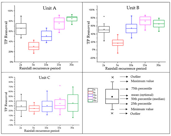In contrast with other synthetic stormwater pollutant parameters, nitrogen species are more difficult to remove due to being highly soluble and strongly affected by the variable wetting and drying regime inherent in bioretention system [37]. Removal efficiency of various nitrogen species in bioretention units is presented in Figure 7. In the current study, both unit A and B were effective on NH4+-N with a removal rate of 69%. Results reveal that three units were not effective for removing NO3—N where the mean removal was in the range of 28%~53%. For TN removal, unit A and unit B showed better removal effect, and the effluent water quality could reach the surface V water standard, which is stipulated by the Standard for Surface Water Environmental Quality (GB3838-2002), representing water qualities that are suitable for agricultural water use, as well as general landscape requirements, and water bodies that exceed V water quality standards are useless. Meanwhile, the unit C removal effect was poor, which was more affected by the rainfall return period. With the gradual increase of rainfall return period, the effects of NH4+-N and TP removal were significantly reduced, similar to the results of Li et al. [32].