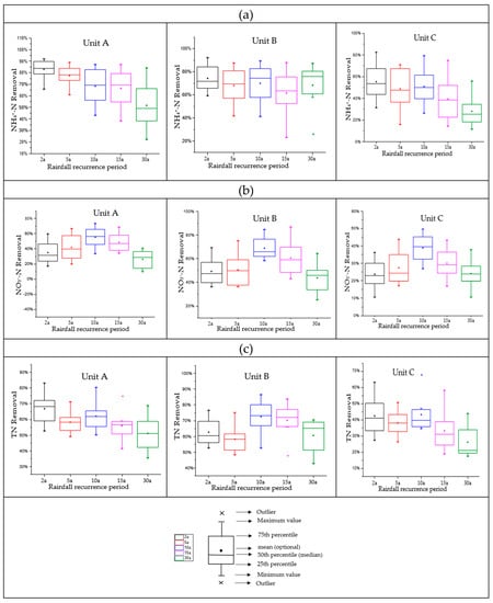 Removal efficiency of nitrogen species in bioretention units (A–C); (a) NH4+-N; (b) NH3—N; and (c) TN.