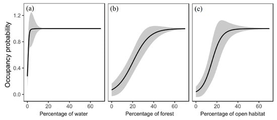 We built occupancy models for the three focal water, forest and open-habitat bird species using the R package Unmarked version 0.12.3 (North Carolina State University, Raleigh, NC, USA) [67] in the R statistical software version 3.5.0 (R Foundation for Statistical Computing, Vienna, Austria) [50]. We performed model selection on both occupancy and detection probability submodels simultaneously using the R package MuMIn version 1.42.1 (Institute of Nature Conservation Polish Academy of Sciences, Krakow, Poland) [68] in the R statistical software version 3.5.0 (R Foundation for Statistical Computing, Vienna, Austria) [50]. We used Akaike’s Information Criterion adjusted for small sample size (AICc) to rank the models (△ AICc < 2) [69]. We examined the goodness of fit of selected models using a chi-square () test with 1000 bootstraps replicates and excluded models with a p-value larger than 0.05 [70]. Considering some top models might have a lower Akaike weight, we adopted a model-averaging approach [69] by starting with the model with the highest Akaike weight and including the model with the second highest weight until . Then the coefficient of each variable in the final model was estimated by the weighted mean of the selected models (according to the Akaike weight of the model) [71]. The response curve of the most important environmental factors for each focal species was generated by plotting the response value (and the 95% confidence intervals) at the range of the variable of interest, based on the prediction of the final occupancy submodel.