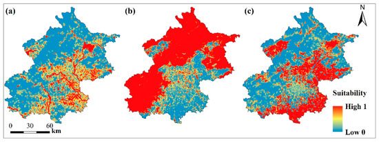 The habitat suitability map for water bird mallard (a), forest bird grey-headed woodpecker (b), and open-habitat bird Eurasian collared dove (c) in Beijing municipality.