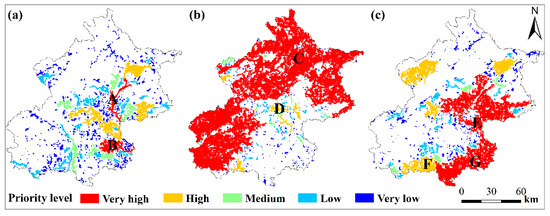 Rank of habitat patches with conservation priority based on their contribution to the habitat network connectivity for the water bird mallard (a), the forest bird grey-headed woodpecker (b), and the open-habitat bird Eurasian collared dove (c) in Beijing municipality. White area represents unsuitable habitat. A: Chaobai river in Shunyi district; B: Liangshui and Xiaotaihou rivers in Tongzhou district; C: forest in Yanqing, Huairou and Miyun districts; D: Wenyu river in Shunyi district; E: grass and cropland in Tong zhou, Chaoyang and Shunyi districts; F: grass and cropland in Fangshan district; G: grass and cropland in Daxing and Tongzhou districts.