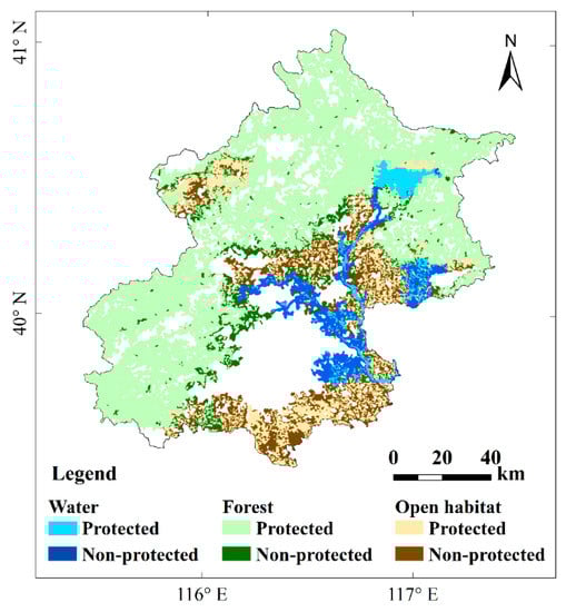 Most of the key habitat patches for forest birds (92%) were located in ecological control areas, whereas a small percentage fell into restricted built-up areas (Figure 5). For water and open-area birds, only 37% and 52% of key habitat patches were in ecological control areas (Figure 5). Key habitat patches for water birds in restricted built-up areas, with a total surface area of 321.3 km2, were mainly distributed in Northeast Beijing (along the Chaobai, Ru, and Ju rivers), Central Beijing (surroundings of Shahe reservoir and the Wenyu river), and Southwest Beijing (along the Liangshui river in Yizhuang). For forest birds, only 272.9 km2 of key habitat patches were located in restricted built-up areas, and mainly located at the foot of the mountains and in the Xiaotangshan modern agricultural park in Changping district. A total of 1036.5 km2 of key habitat patches for open-habitat birds occurred in restricted built-up areas, and were mainly distributed in the Daxing, Tongzhou, and Shunyi districts.
