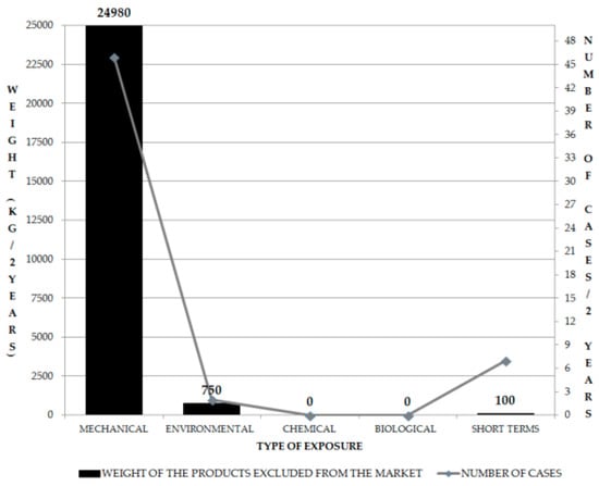 The mechanical factor resulted in the exclusion of 24,980 kg of products from the trade turnover in a two-year period and 750 kg as a result of environmental exposure (Figure 2). As a result of these events, the package was damaged, so as to disrupt the protective function which preserves the product from adverse weather conditions, or crushes of the packaged product and other undesirable factors. The customers making purchases are also guided by the design and condition of the packaging, so damage will have a negative impact on their purchase decisions. The studies show that even subtle packaging features such as color or shape are important for the choice of food articles []. The respondents indicated that in the event of a significant damage to the transport package (“scattering” of the pallet or deformation of the package), the item is returned to the production plant or products are disposed of. According to the requirements of the transport department, all transportation units had insurance of cargo, so-called OCP (carrier’s civil liability), which involves the reimbursement of costs incurred as a result of damage incurred during transportation. In Poland today, compensation is regulated on the basis of documents confirming the disposal of damaged goods, withdrawn from commercial turnover.