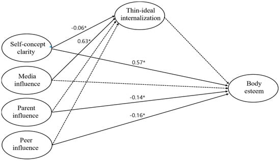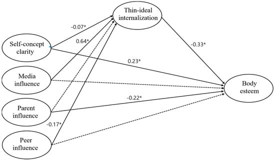 According to the bootstrap results (Table 3), the self-concept clarity and two dimensions of the tripartite influence (i.e., media and peer) had significant indirect relationships on body esteem through the mediating variable (i.e., thin body internalization) for girls, but there was no significant indirect relationship found for boys. Specifically, for girls, higher levels of media and peer pressure were positively associated with the internalization of the thin-ideal and, in turn, the internalization of the thin-ideal was negatively associated with body esteem. Contrarily, two dimensions of the tripartite influence (i.e., parent and peers) had a negative direct relationship with body esteem for boys, but only parental pressure had a negative direct relationship with body esteem for girls.