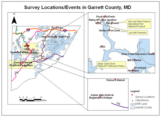 The study area is Garrett County, Maryland, USA. The county is located in the northwestern edge of the state with a population of 30,097 [33]—the third least populous county in the state. Garrett County is an all-year-round tourism destination with over 76,000 acres (310 km2) of lakes, state parks, and publicly accessible forestland and 20 National Register of Historic Places. Popular activities include camping, hiking, rock climbing, skiing, hunting, rafting, and horseback riding, among others. Tourism accounts for about 10% of the county’s total employment and is the third largest employer, following educational and health services (19%) and construction (13%) [33]. Surveys were conducted at 21 different locations (Figure 1) determined by the Garrett County Chamber of Commerce as the most representative of the county’s tourism attractions. These 21 locations included state parks, festivals/events, restaurants, shopping centers, antique stores, farm markets, and skiing and man-made whitewater rafting resorts.