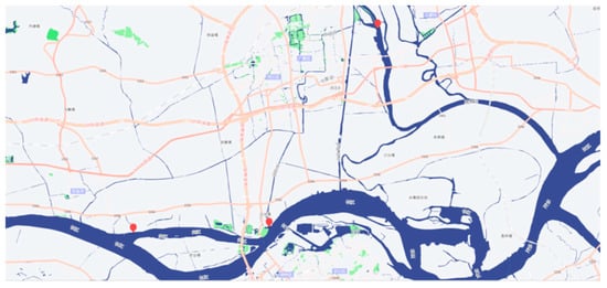 Figure 1 is a location map of some water quality automatic monitoring stations in Yangzhou water source area extracted by using the Gaode map API/SDK interface. The three red balloons shown in the figure are the locations of water quality automatic monitoring stations in Shierwei, Guazhou, and Wanfu Gate, from the left to the right. The blue area is part of the water system of the Yangzhou section of the Yangtze River.
