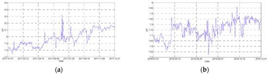 Graphs of the pH variation trend of Guazhou Water Source. (a) pH variation trend in 2016, (b) pH variation trend in 2017.