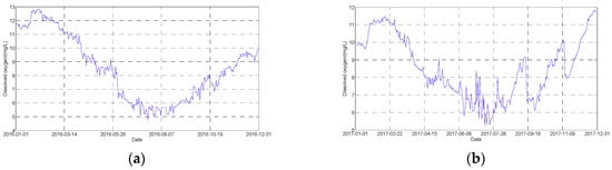 Dissolved oxygen variation trend of Guazhou Water Source. (a) Dissolved oxygen variation trend in 2016, (b) dissolved oxygen variation trend in 2017.