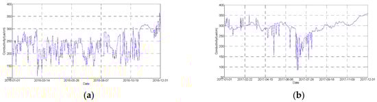 Conductivity variation trend of Guazhou Water Source. (a) Conductivity variation trend in 2016, (b) conductivity variation trend in 2017.