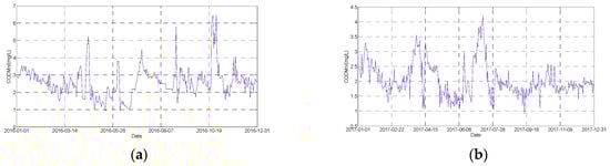 According to the 731 sets of water quality monitoring data collected in 2016 and 2017, the time variation trend of water quality parameters of the water source of the Yangtze River in Guazhou was analyzed. For time-series data, we drew a line graph to reflect the characteristics of each water quality parameter over time. Figure 2, Figure 3, Figure 4, Figure 5, Figure 6 and Figure 7 show the annual trends of pH, dissolved oxygen, conductivity, turbidity, chemical oxygen demand (CODMn), and NH3–N in 2016 and 2017. Table 1 and Table 2 show the monthly average values of water quality monitoring parameters of the water source in Guazhou in 2016 and 2017.
