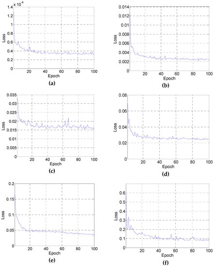 Variation of the loss function with the number of iterations epochs. (a) pH, (b) dissolved oxygen, (c) conductivity, (d) turbidity, (e) CODMn, (f) NH3–N.