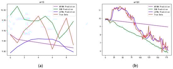 In order to verify the prediction effect of our model based on LSTM deep neural networks in depth, this paper compared the model with two other classical time-series prediction models, autoregressive integrated moving average (ARIMA) and support vector regression (SVR). We used a set of 731 dissolved oxygen data monitored by the Guazhou automatic water quality monitoring station in 2016 and 2017 as the training set (n = 731) and respectively predicted the dissolved oxygen data in the next 10 days (m = 10) and the next 6 months (m = 181). For model prediction accuracy, MSE was chosen as the unified metrics. The experiment results are shown in Figure 12 and Table 4.