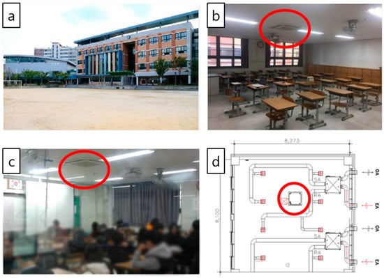 Layout of the test classroom, indicating the locations of the EHP and ERVs: (a) school building, (b,c) test classroom, (d) ductwork and locations of the systems.
