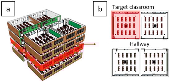Test school building (a) and plan of the classrooms and hallway (b).