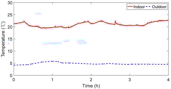 Figure 4 shows the indoor and outdoor temperatures measured during the field test. The outdoor temperatures remained almost unchanged (approximately 5 °C), and the indoor temperatures fluctuated around the set-point temperature. Figure 5 shows the measured energy consumption of the EHP for each interval under different ventilation modes. The results in Figure 5 are not calibrated. The number of students changed over the test period; thus, calibration using Equation (3) was required.