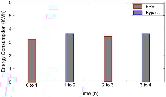 Table 5 presents the measured and calibrated energy consumptions. In the first hour, the classroom was ventilated under the ERV mode, and in the second hour, the bypass mode was applied. The mode was changed every hour, as shown in Figure 5. For the first and third time intervals of the ERV mode, the calibrated energy consumptions were reduced owing to the reduced number of students. Only half of the reference number of students occupied the classroom during the first hour, and no students were found in the classroom during the third interval, because of a gym class. For the bypass hours, the number of students in the classroom was equal to the reference number.